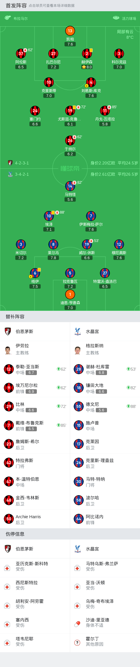 最终比赛结束,双方0-0握手言和。萨尔和瓦塔拉都错失了多次得分良机,而塞门约的绝杀险些成功。球队阵容和技术统计显示,本场比赛双方实力相当,都有出色表现,但最终未能决出胜负。伯恩茅斯与水晶宫的这场较量在激烈的比赛中画上了句号,期待双方在未来的比赛中继续交手,给球迷带来更多精彩的比赛。